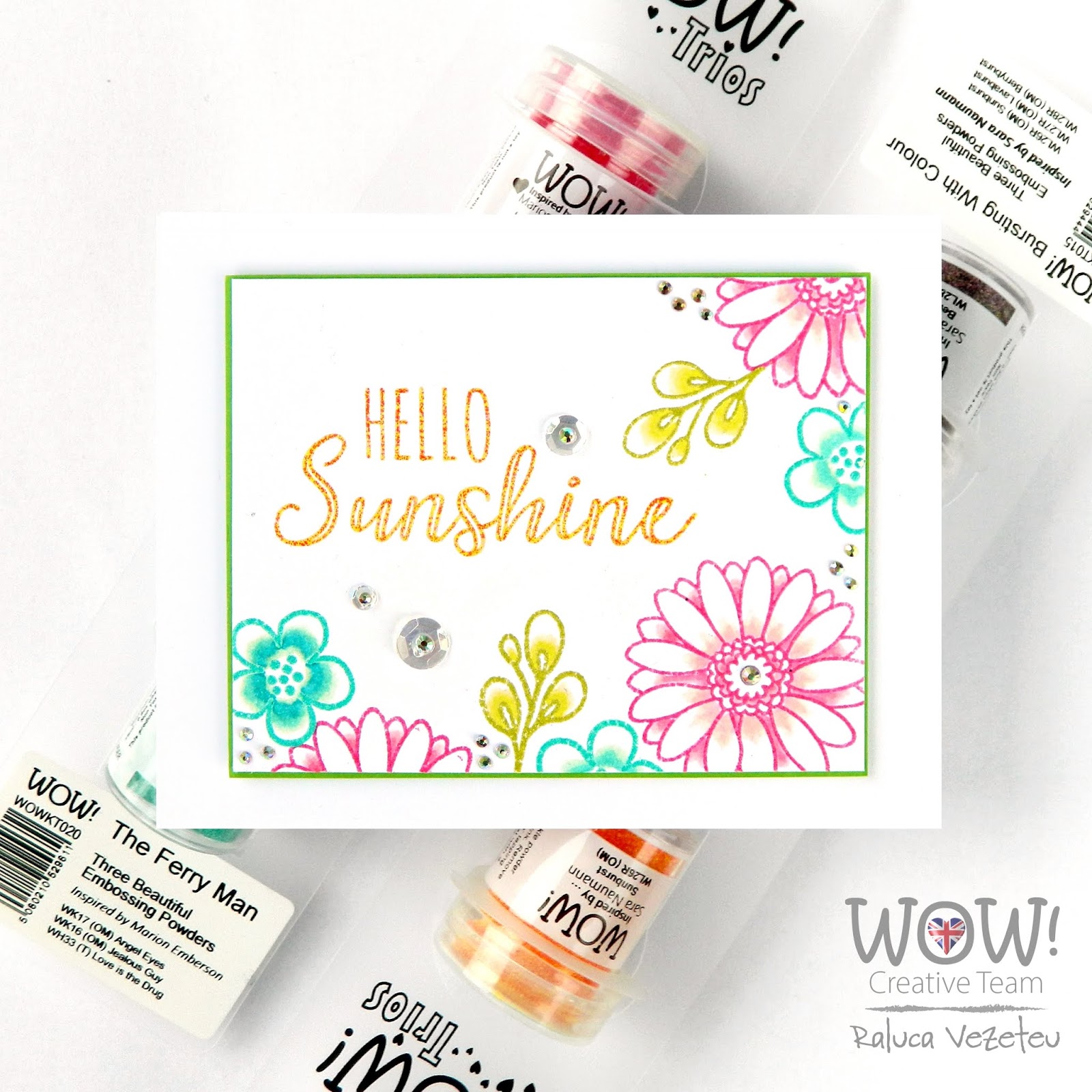 For my card I played with the fabulous WOW! Trio Bursting with Colour *Sara Naumann Exclusive* and the gorgeous WOW! Trio The Ferry Man embossing powder sets, the awesome WOW! Superior Smooth White Cardstock - A5, WOW! Superior Smooth White Cardstock - A4, along with these WOW must have tools WOW! Clear Ultra Slow Drying Embossing Pad, WOW! Dual Speed Heat Tool - Euro and WOW! Premium Embossing Craft Mat.